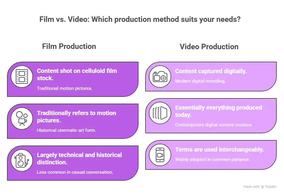 A quick note on terminology. The distinction between film and video production is largely technical and historical. Film traditionally refers to content shot on celluloid film stock, as in motion pictures. Video production refers to content captured digitally, which is essentially everything produced today, from YouTube ads to Netflix originals.